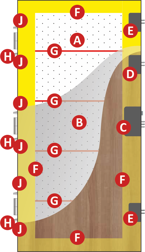 ![]() | A Polnilo: Panel DELTA WKW. B Pocinkana jeklena pločevina, laminirana s PVC folijo, debelina 0,7 mm. C Glavna ključavnica. D Dnevna ključavnica. E Pomožna ključavnica v sistemu glavne ključavnice. F Ojačan okvir iz lepljenega lesa. G Prečna jeklena ojačitev. H 3D tečaj. J Pasivni zaklep. |